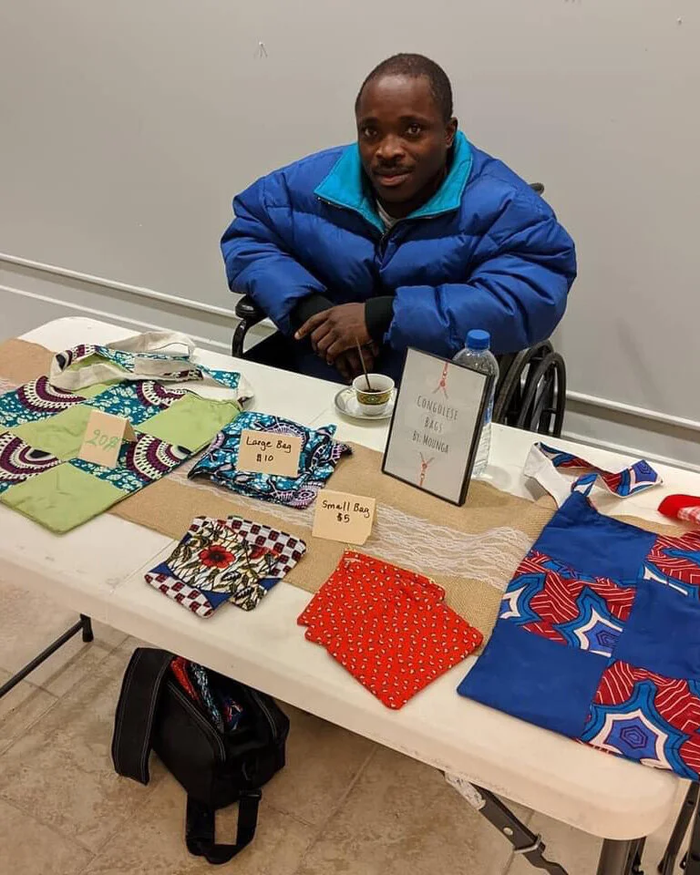 Mounga is a refugee from the Democratic Republic of Congo. He came to the United States in February 2019. Before this, Mounga lived in Burundi. In Burundi, Mounga worked as a carpenter. After Mounga came to the United States, he learned how to sew. He has been sewing and selling products made with African fabrics since about July 2019.